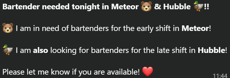 Most bartenders are planned by their association. However, it sometimes happens that an association is not able to attend anymore or that the shift has been open since the beginning because no association wanted to take it. Then Hubble and Meteor rely on the announcements that are sent in the Hubble & Meteor Bartenders Group.