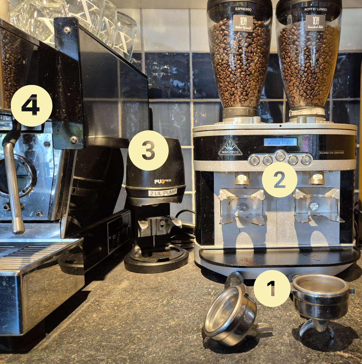 3. Use the automatic pump to grind and dose the coffee in the portafilter The machine will give 2 pumps to dose the filter